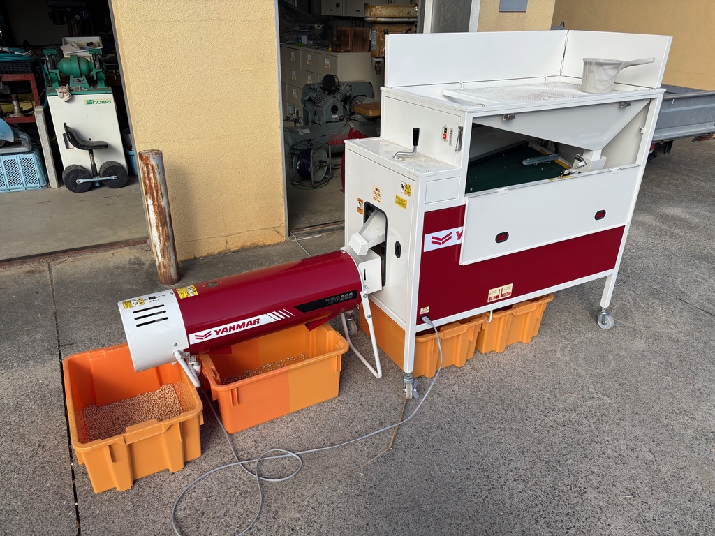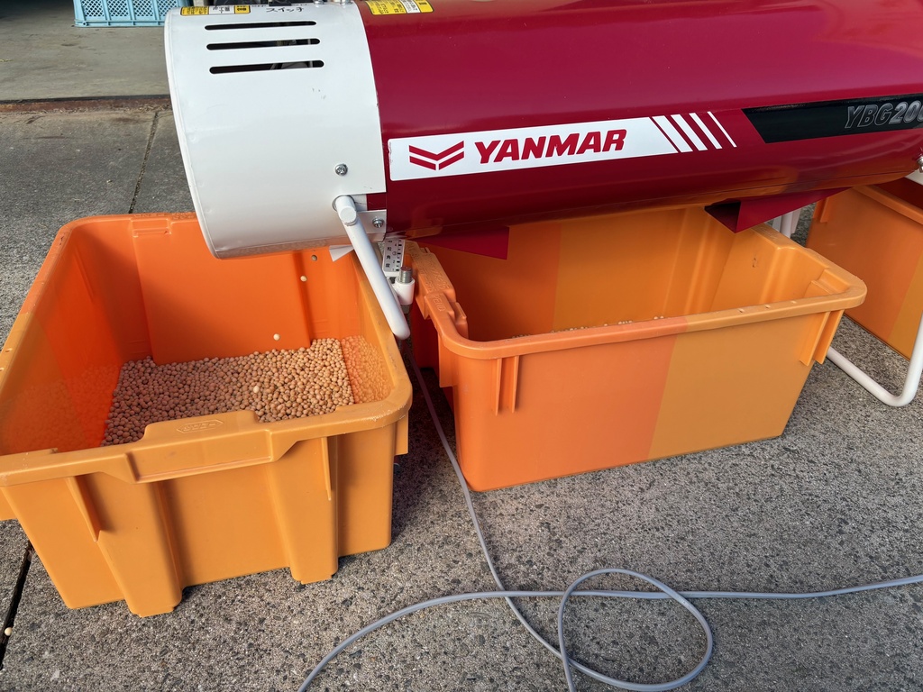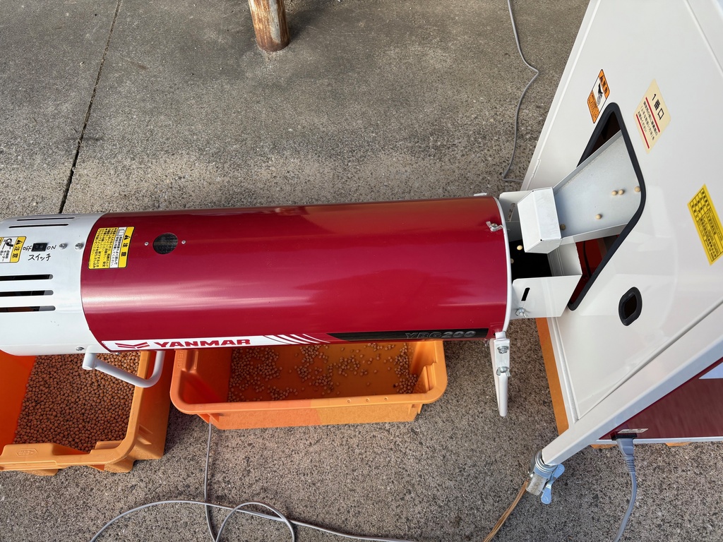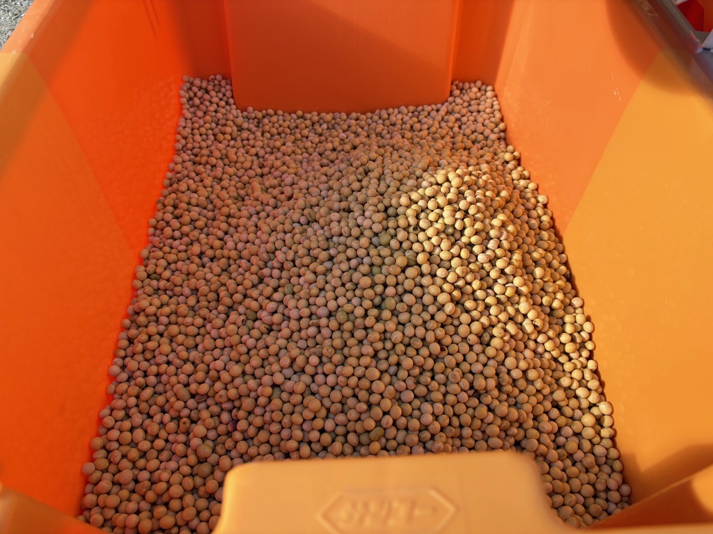 右の機械が選別機になっており、丸い大豆以外はベルトコンベアに乗って下に落とされます。
