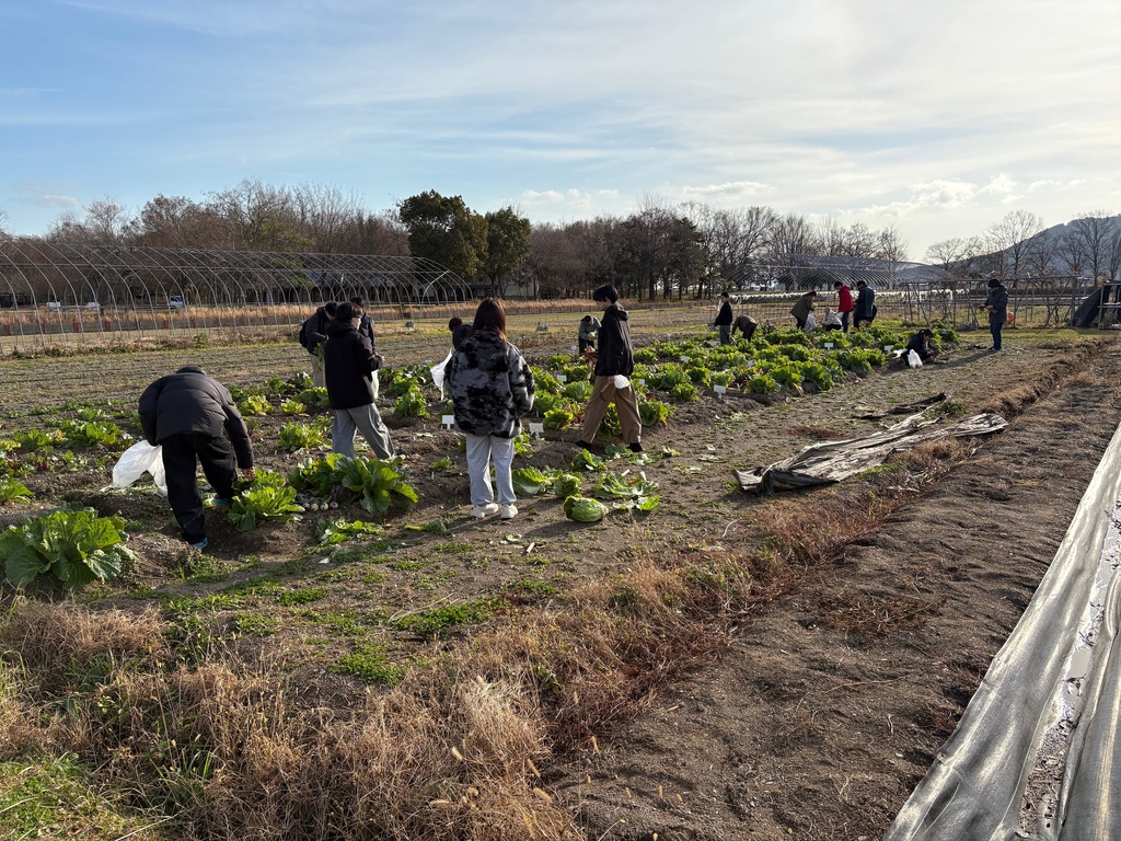 植物生産学の授業後に、たくさんの学生がカブとハクサイの収穫に来ていました。