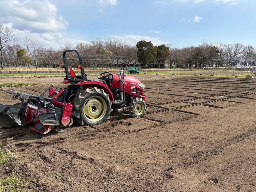 トラクターで耕耘した後、畝立てのための目印をつけ、