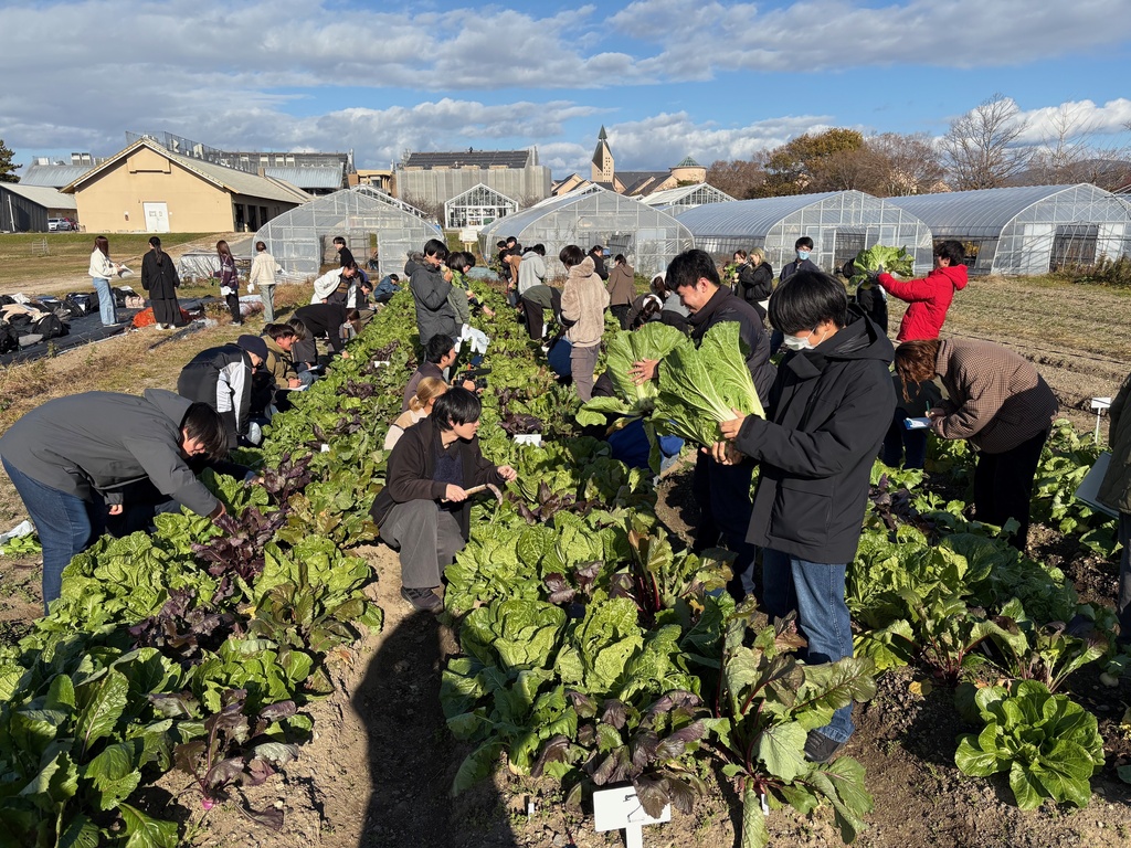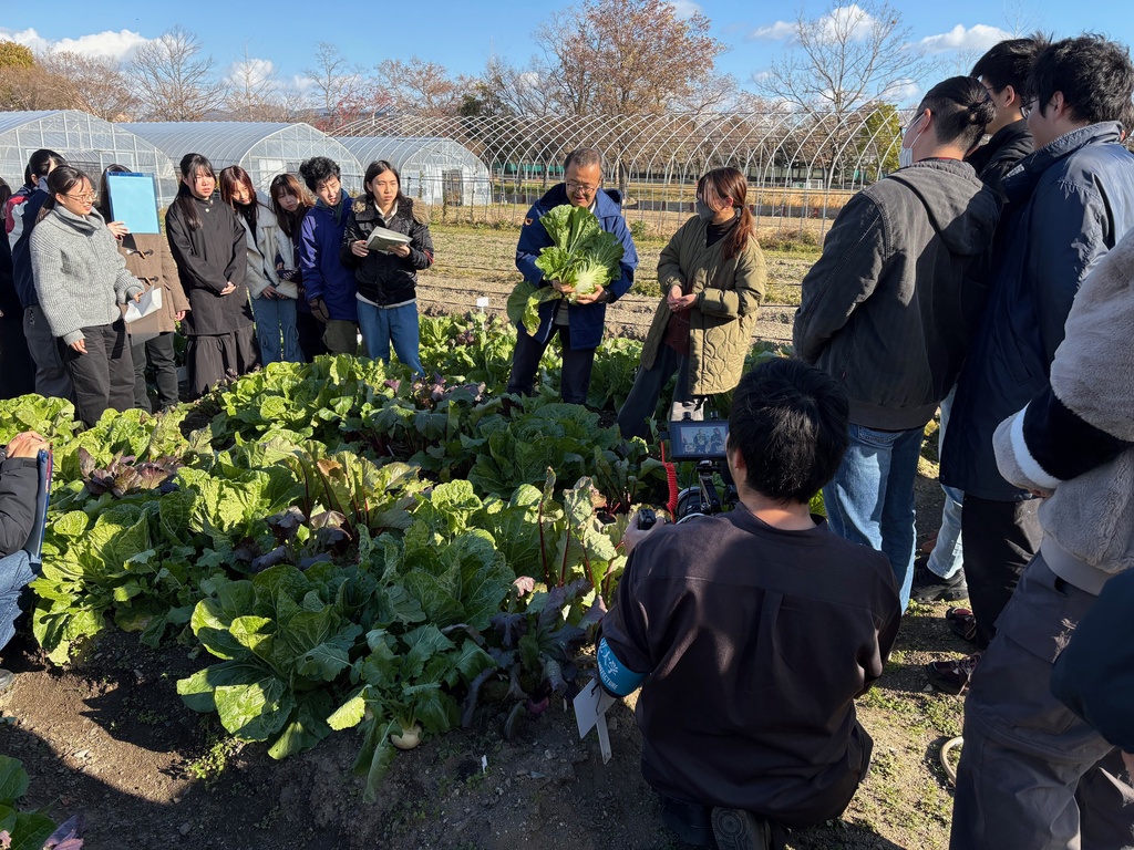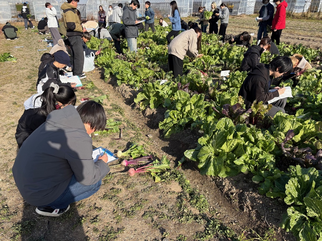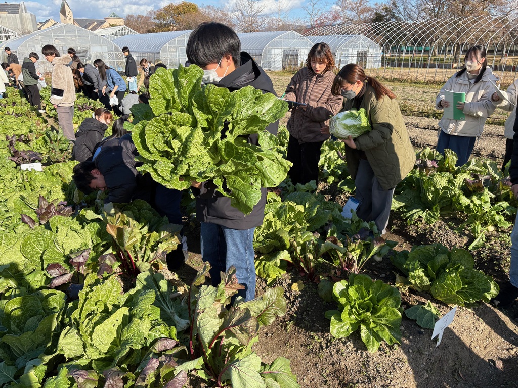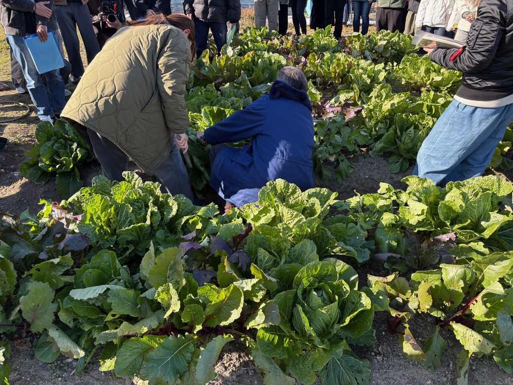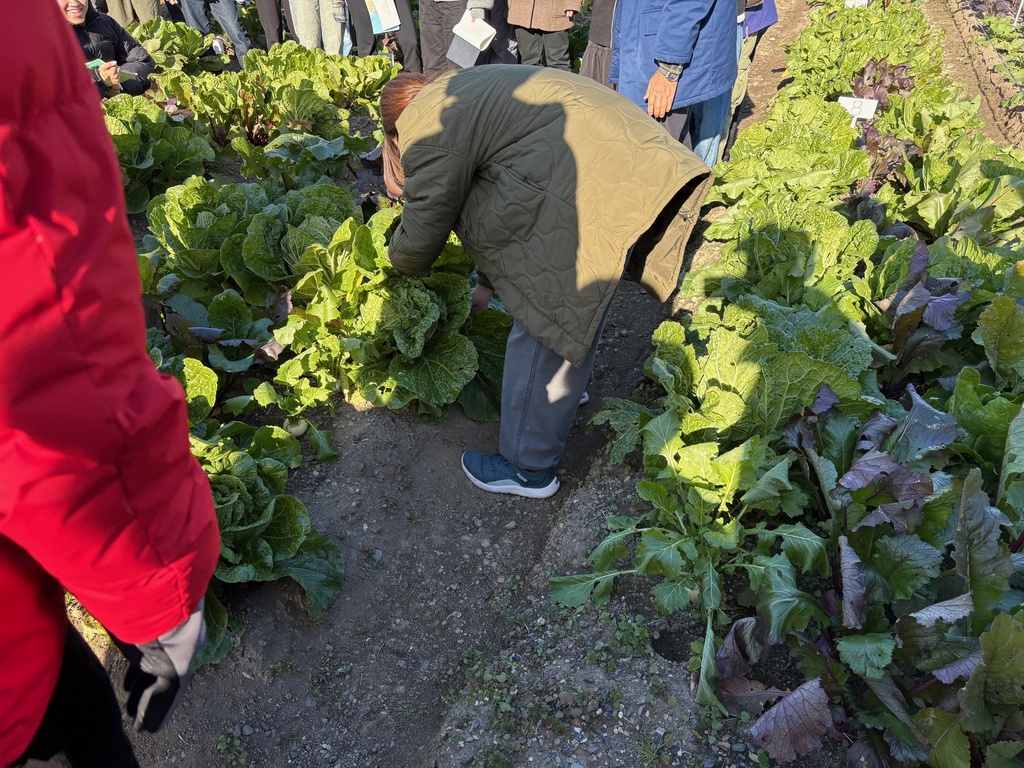 先生がハクサイの収穫の仕方をレクチャーしています。