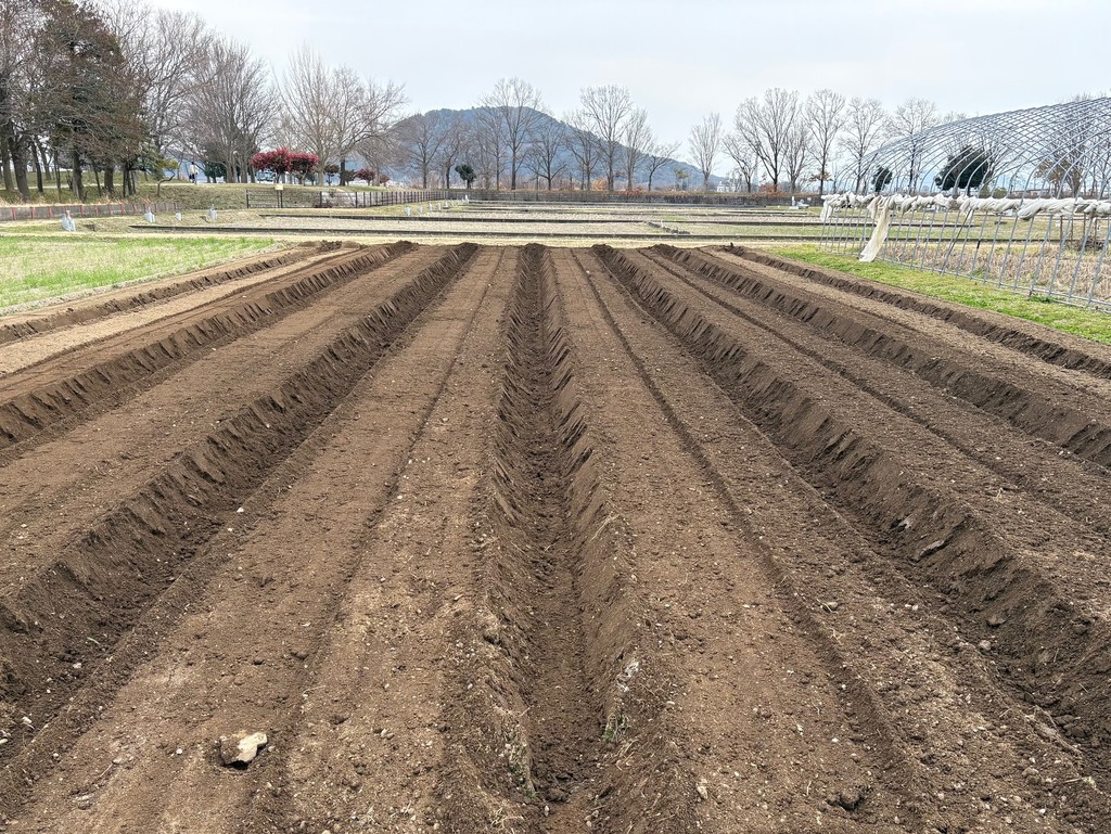 先日バーク堆肥をすき込んだ畑に肥料を散布し、畝を立てました。